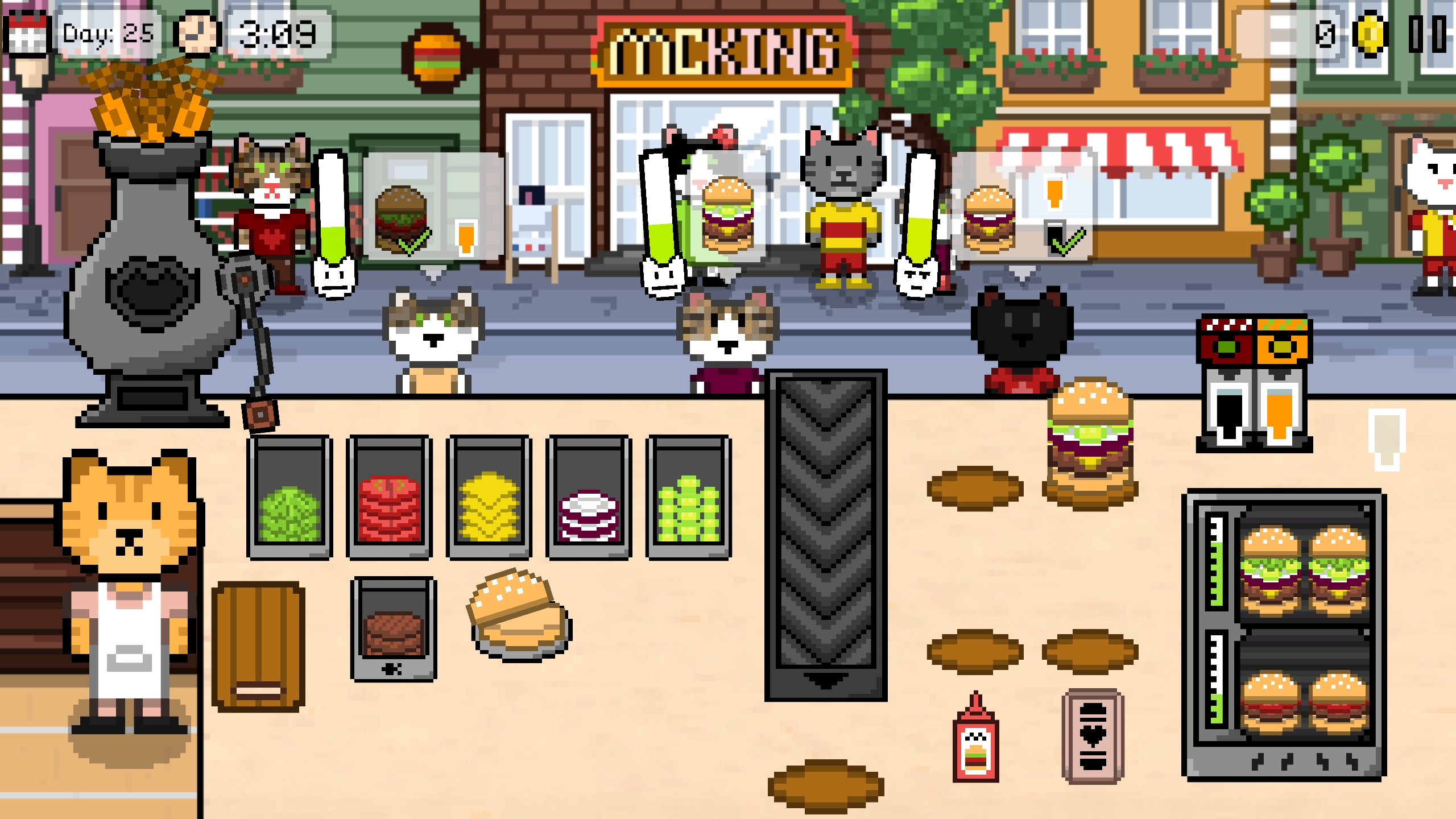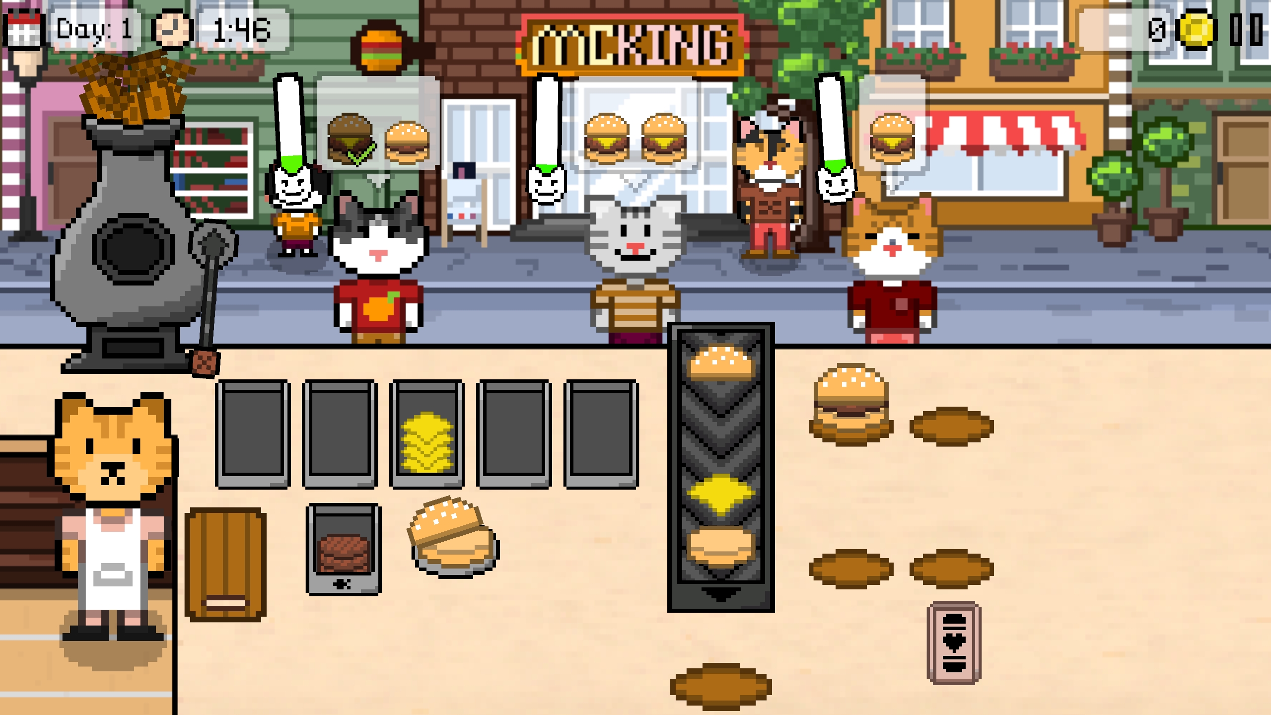 This version has been optimized by reducing visual quality to run smoothly on all devices. The original demo is available on Steam; click this panel to access it. If you enjoy Kitty Burger, don’t forget to add it to your Steam Wishlist!